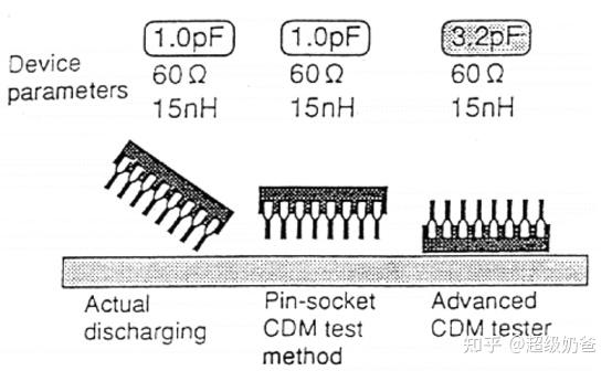 此种模式的放电时间更短,仅约几毫微秒之内,而且放电现象更难以真实的被模拟。因为IC内部累积的静电会因IC组件本身对地的等效电容而变,IC摆放的角度与位置以及IC所用的包装型式都会造成不同的等效电容。由于具有多项变化因素难定,因此,有关此模式放电的工业测试标准仍在协议中,但已有此类测试机台在销售中。该组件充电模式(CDM)ESD可能发生的原因及放电的情形显示于图3.1(a)与图3.1(b)中。该组件充电模式静电放电的等效电路图显示于图3.2(a)中。IC在名种角度摆放下的等效电容值显示于图3.2(b)中,此电容值会导致不同的静电电量累积于IC内部。