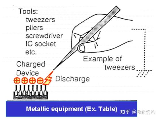 IC自IC管中滑出后,IC脚朝上,但经由接地的金属工具而放电。