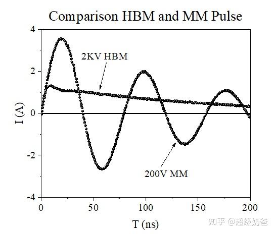 因为大多数机器都是用金属制造的,其机器放电模式的等效电阻为0Ω,但其等效电容定为200pF。由于机器放电模式的等效电阻为0,故其放电的过程更短,在几毫微秒到几十毫微秒之内会有数安培的瞬间放电电流产生。有关2KV HBM与200V MM的放电电流比较,显示于图2.2中。