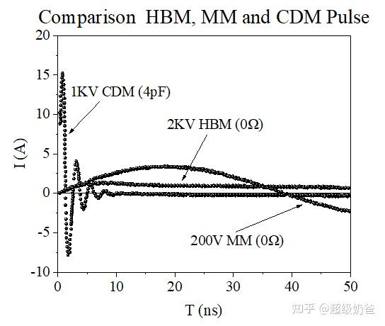 有关2KV HBM,200V MM,与1KV CDM的放电电流比较,显示于图3.3中。其中,该1KV CDM的放电电流在不到1ns的时间内,便已冲到约15A的尖峰值,但其放电的总时段约在10ns的时间内便结束。此种放电现象更易造成集成电路的损伤。